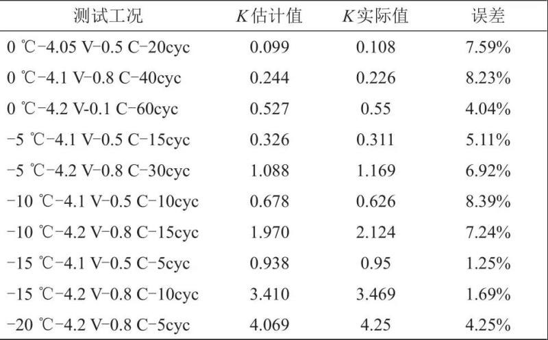 容量衰退速率模型在Matlab中進(jìn)行仿真驗(yàn)證,模型對不同工況下容量衰退速率的估計值與實(shí)際值對比如表3所示??梢钥闯鏊⒌娜萘克ネ四P偷墓烙嬚`差在10%以內(nèi)。且80%的參考工況估計誤差低于8%,容量衰退模型的估計精度總體較高。按單次有效充電循環(huán)在-20工況的容量衰退0.04計算,由于充電策略將第一段充電過程分為20個階段,估計誤差按照最大值8.39%計算,則每個階段最大估計誤差為1.707%,覆蓋所有工況的最大容量衰退估計誤差為34.14%。在實(shí)際過程中并不會在所有階段同時達(dá)到最大估計誤差8.39%,取中間值5.11%估算則整個充電過程的總估計誤差在20.79%以內(nèi)。