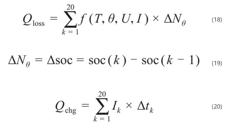 Qloss和Qchg的計算式如式(18),(19),(20),其中?Nθ為第k階段的等效充電循環(huán)次數(shù)。?SOC為每個階段的充電容量相對于額定容量的百分比,其中?tk為第k個階段所用的充電時間,在單個充電階段“k”內(nèi)電流是一致的。