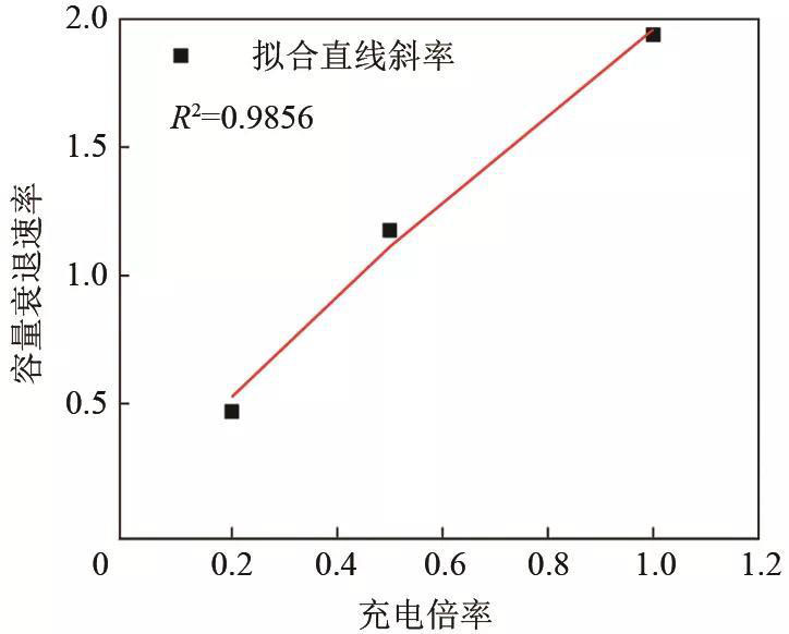 得到充電截止電壓加速度因子的數(shù)學(xué)表達(dá)式后接著分析充電倍率對鋰離子電池低溫充電老化的影響。同樣取-15 ℃、4.2 V為參考工況,對不同充電倍率下鋰離子電池容量衰退曲線進(jìn)行擬合,在曲線擬合時發(fā)現(xiàn)數(shù)據(jù)對指數(shù)函數(shù)的擬合度最高,但是不同充電倍率的擬合參數(shù)不存在線性變化關(guān)系,不能用于描述充電倍率對充電老化速率的影響規(guī)律,因此改用直線進(jìn)行擬合,如圖8所示。不同充電倍率下擬合直線的斜率存在線性變化趨勢。同時斜率參數(shù)可以反應(yīng)低溫充電容量衰退的速率。對不同充電倍率衰退擬合直線的斜率參數(shù)進(jìn)行擬合如圖9所示。