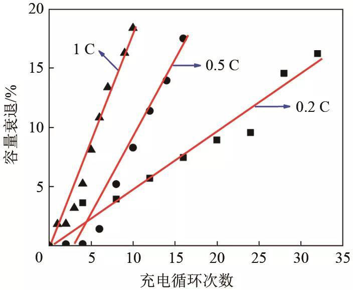 不同充電電流倍率下電池容量衰退隨充電循環(huán)次數(shù)的實(shí)驗(yàn)數(shù)據(jù)如圖3所示。從圖中可以看出隨著充循環(huán)次數(shù)的增加,電池容量的衰退也呈直線上升,而隨著充電倍率的增大,上升曲線的斜率逐漸變大,說明不同充電倍率下,充電容量衰退速率隨充電倍率的增加而增加。在0.2 ~0.5 C增加速度最快。