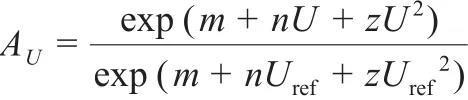 式中,m為197.9676;n為98.4659,z為12.2760。由于函數(shù)f (θ,T)是在0.5 C-4.2 V工況下建立的,所以在這里取充電截止電壓4.2 V為參考工況,取實(shí)際充電截止電壓下容量衰退速率KU與參考電壓的容量衰退速率KUref的比值為充電截止電壓加速度因子AU。則AU的表達(dá)式為