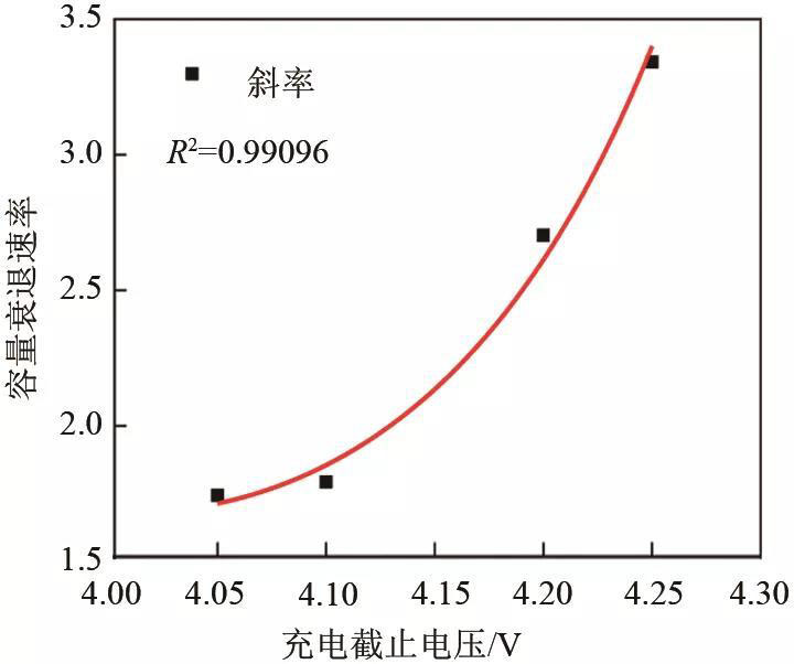 因?yàn)閿M合的結(jié)果為直線,參數(shù)截距代表直線與y軸的截距,雖然不成線性變化,但不影響對容量衰退曲線斜率的估計。而擬合直線的斜率直接關(guān)系到不同充電截止電壓下容量衰退的變化速率,因此僅考慮斜率參數(shù)即可表示充電截止電壓對容量衰退速率的影響。如圖7所示對各個擬合曲線的斜率參數(shù)再次進(jìn)行曲線擬合。