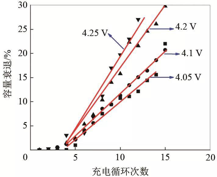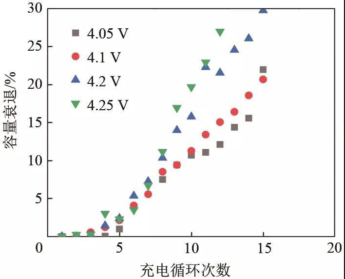 不同充電截止電壓下電池循環(huán)充放電容量衰退的測試數(shù)據(jù)如圖2所示。可以看出,在充電截止電壓為4 V時,容量衰退先快后慢。而4.05 V~4.25 V電壓區(qū)間內(nèi)容量衰退曲線在4次充電循環(huán)之前較為平緩,斜率接近零,容量衰退<1%,在4次充電循環(huán)之后突然加劇衰退,呈直線趨勢上升。