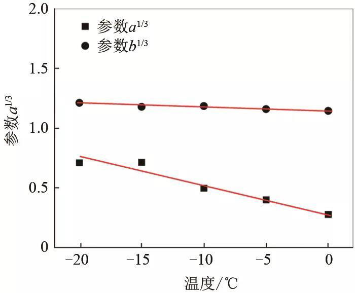 從擬合曲線可以看出,各個溫度測試點(diǎn)都有較高的擬合度,接下來再對參數(shù)a,b進(jìn)行擬合,如圖5所示。參數(shù)a,b與溫度參數(shù)之間并沒有明顯的線性關(guān)系,對其開方之后,從擬合圖像中可以看出a(1/3)和b(1/3)對溫度具有較高的擬合度。