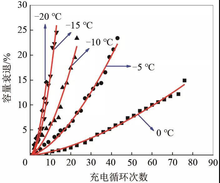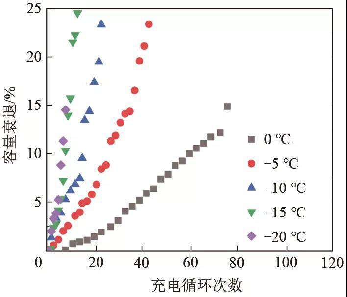 (1)低溫下鋰離子電池充電老化速度隨充電溫度的減小而急劇增加,在小于-15 ℃時、充電循環(huán)大于5次之后容量衰退速率呈直線上升。其次充電倍率的增加和充電截止電壓的增加都會加劇電池的老化速度。