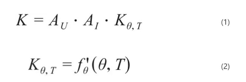 通過對不同充電溫度、截止電壓、充電倍率條件下的多應(yīng)力充放電實(shí)驗(yàn)數(shù)據(jù)可以得到,對該鋰離子電池充電容量衰退速率的影響力:充電溫度>充電倍率>充電截止電壓。因此,我們以不同溫度下容量衰退測試數(shù)據(jù)作為基準(zhǔn)進(jìn)行容量衰退模型的建立,而充電倍率和充電截止電壓作為輔助影響因子。命名為充電截止電壓加速度因子AU和充電倍率加速度因子AI,則不同充電應(yīng)力下的容量衰退速率模型的數(shù)學(xué)表達(dá)式如式(1),(2)。其中K為容量衰退速率;θ為電池等效充電循環(huán)次數(shù);T為充電溫度℃。Kθ,T表示充電溫度為T且等效充電循環(huán)次數(shù)為θ時的充電容量衰退速率。
