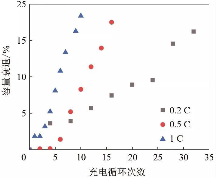 從圖1中可以看出隨著溫度的降低,充電衰退速率加快。在-20 ℃充電溫度下,僅10個充電循環(huán),電池容量衰退就接近20%。