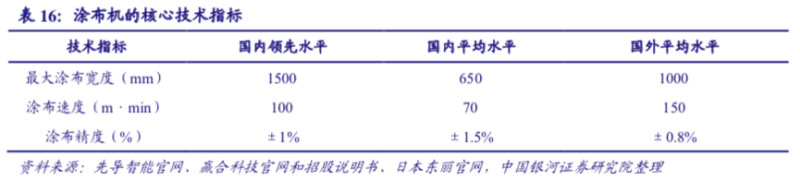 目前,國(guó)產(chǎn)廠商在高端涂布設(shè)備領(lǐng)域離日韓企業(yè)還有差距,尚未完成進(jìn)口替代。