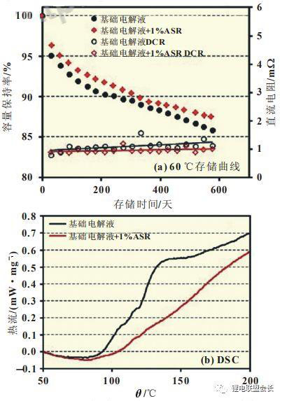 因?yàn)殡姵馗邷卮鎯?chǔ)過程中的容量損失主要來自陽極表面的副反應(yīng)造成的活性鋰離子損失,所以在電解液中添加SEI膜熱穩(wěn)定添加劑(ASR)可以提升SEI膜的高溫穩(wěn)定性,降低陽極表面的副反應(yīng)活性,減少活性鋰離子損耗。