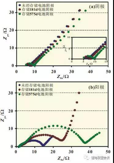 電化學(xué)阻抗譜(見圖5)中,雖然陰極Rct隨高溫存儲(chǔ)時(shí)間延長(zhǎng)而增大[圖5(a)],但陰極Rct較小,對(duì)電池內(nèi)阻影響也較小。陽極EIS[圖5(b)]RSEI隨存儲(chǔ)時(shí)間變化不明顯,但Rct隨存儲(chǔ)時(shí)間延長(zhǎng)而顯著增加。由于高溫存儲(chǔ)過程中電解液副反應(yīng)產(chǎn)物沉積于石墨表面,陽極比表面積隨存儲(chǔ)時(shí)間增加而減小,存儲(chǔ)0、181和575d電池陽極比表面積分別為3.42、2.97和1.84cm2/g。陽極比表面積下降使發(fā)生在陽極表面的電化學(xué)反應(yīng)活性減小,導(dǎo)致陽極/電解液表面的電荷轉(zhuǎn)移電阻Rct增大。