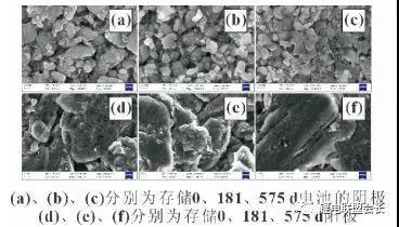 圖3(d),(e),(f)中,存儲(chǔ)181和575d電池陽極首次充電比容量分別為未經(jīng)存儲(chǔ)電池陽極首次充電比容量的90.4%和84.5%,與實(shí)際電池的容量保持率接近。所以,電池容量衰減的主要原因是全電池中活性鋰離子的損失。