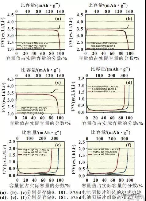 將不同存儲(chǔ)時(shí)間的電池在100%SOC拆解,以其中的極片作為工作電極、鋰片作為對(duì)電極制作扣式電池,以0.1C倍率進(jìn)行充放電測(cè)試(圖3)。