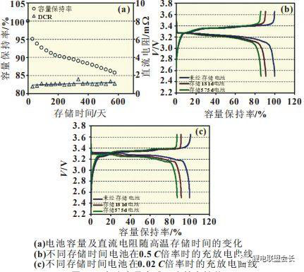 100%SOC電池60℃存儲(chǔ)一定時(shí)間后,在2.50~3.65V之間以0.5C倍率進(jìn)行一次放電-充電循環(huán)。然后將滿充電池繼續(xù)在60℃存儲(chǔ)。如此反復(fù),記錄電池的容量衰減過程。在每次容量測(cè)試過程中,測(cè)試電池5C/30s的直流內(nèi)阻(DCR)。