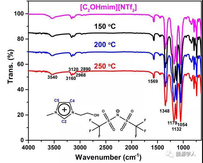 圖3. 不同溫度下離子熱鋰化反應(yīng)后回收離子液體的紅外光譜。