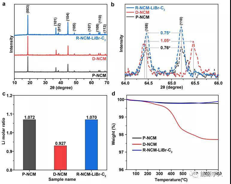 圖1. a) P-NCM,D-NCM和R-NCM-LiBr-C2的XRD圖;b) 局部放大的XRD圖;c) 基于ICP結(jié)果計算的Li元素含量;d) 空氣下三種材料的熱重曲線。