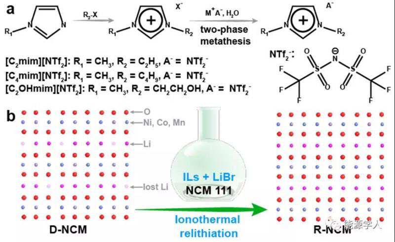 示意圖1. a)離子液體合成示意圖;b)離子熱鋰化策略修復(fù)三元正極材料的示意圖。