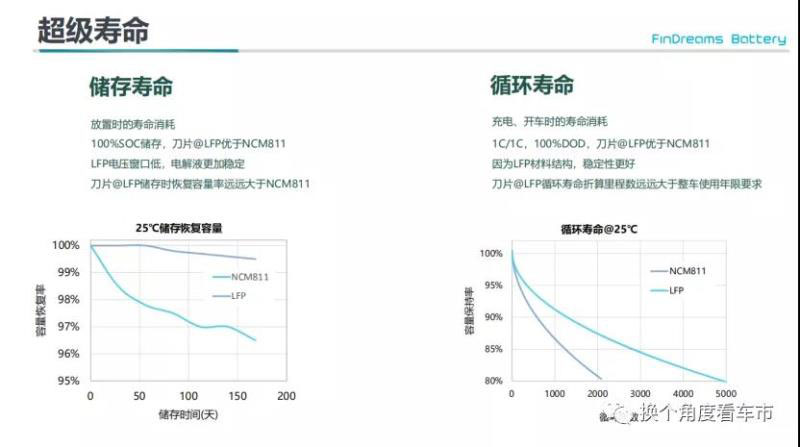 “超級(jí)壽命”:刀片電池的存儲(chǔ)壽命和循環(huán)壽命均優(yōu)于三元電池,可以保證長(zhǎng)的8年甚至更長(zhǎng)時(shí)間的使用,50萬公里甚至100萬公里更長(zhǎng)里程的使用。因?yàn)榈镀姵氐牟牧辖Y(jié)構(gòu)和穩(wěn)定性更好,循環(huán)壽命折算里程數(shù)遠(yuǎn)遠(yuǎn)大于整車使用年限要求。