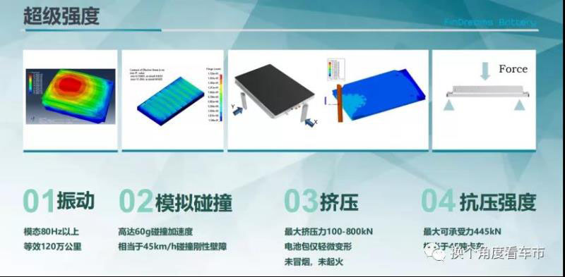 “超級(jí)強(qiáng)度”:刀片電池能夠滿足四種狀態(tài)下的強(qiáng)度變化,分別是“刀片電池”的振動(dòng)、模擬碰撞的強(qiáng)度、擠壓的強(qiáng)度和抗壓的強(qiáng)度,其中刀片電池的抗壓強(qiáng)度其最大承受力為445kN,相當(dāng)于45噸卡車。
