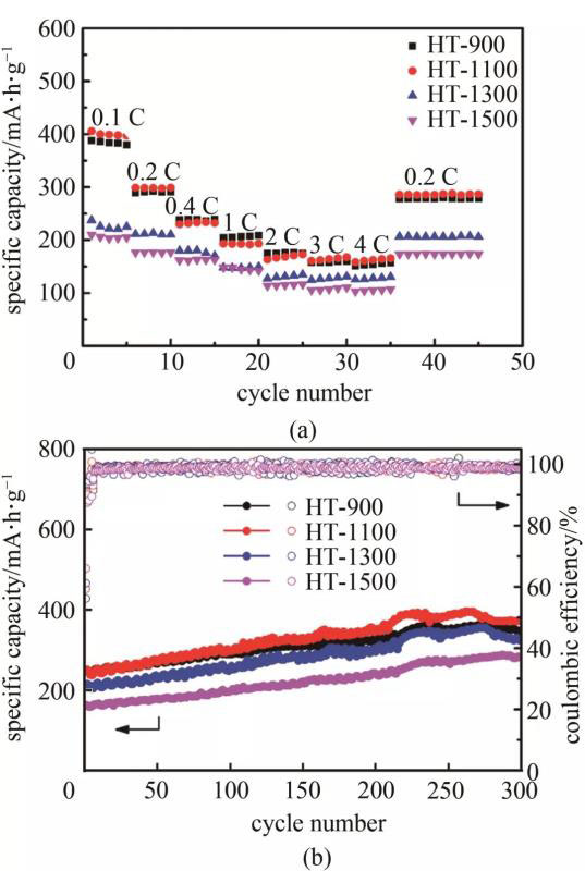 圖7(a)為菱角殼基硬炭電極的倍率性能圖。HT-900、HT-1100、HT-1300、HT-1500電極在0.2 C電流密度下的可逆比容量分別為284.9 mA·h/g、294.6 mA·h/g、211.2 mA·h/g、176.5 mA·h/g,當(dāng)電流密度為4C時,可逆比容量能保持在159.9 mA·h/g、167.6 mA·h/g、131.2 mA·h/g、110.4 mA·h/g,容量保持率在56.12%、56.89%、62.12%、62.55%。大電流密度下,HT-900和HT-1100可逆比容量衰減較快,而HT-1300和HT-1500可逆比容量衰減的相對較少。當(dāng)電流密度恢復(fù)到0.2 C時,HT-900、HT-1100、HT-1300、HT-1500的可逆比容量分別為278.1 mA·h/g、285.9 mA·h/g、206.8 mA·h/g、173.4 mA·h/g,容量保持率分別為97.61%、97.05%、97.92%、98.24%。由圖7(b)可知,HT-x電極在0.4 C電流密度循環(huán)300次時,可逆比容量隨循環(huán)次數(shù)增加先增大之后趨于穩(wěn)定,容量的增加可能來源于鈉離子的嵌入和脫出對電極材料的活化,其中HT-900和HT-1100可逆比容量相近,且均高于其他兩個樣品。