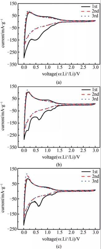 圖5為菱角殼基硬炭電極在0.1 mV/s掃速下的CV曲線。首次循環(huán)過程中,0~1.25 V范圍內(nèi)出現(xiàn)的還原峰對應(yīng)SEI膜的生成。0 V左右的氧化峰的電壓大于還原峰的電壓,這是由于鋰離子儲存在硬炭材料中的微孔中時,會在單層碳兩邊和納米微孔周圍發(fā)生吸脫附,近似為金屬態(tài)。第2圈的CV曲線與第3圈基本重合,說明容量衰減主要在首次循環(huán)過程中,后續(xù)循環(huán)過程容量基本不發(fā)生衰減。