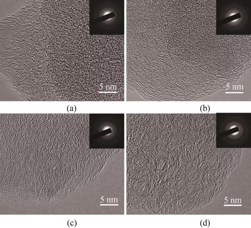 圖3 菱角殼基硬炭的TEM和SAED照片(a) HT-900; (b) HT-1100; (c) HT-1300和(d) HT-1500