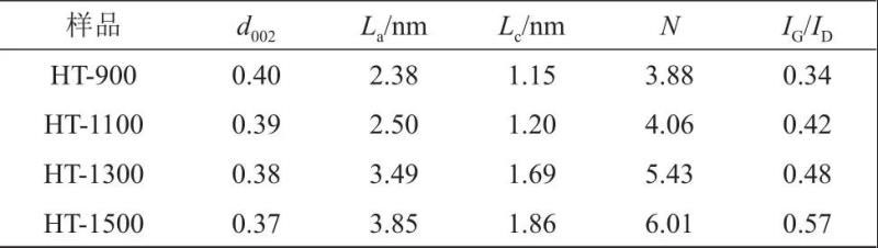 由圖4可知,HT-x樣品的N2吸脫附曲線為IV型,首先在低壓區(qū)就有一定吸附,相對壓力接近1.0時,吸附量迅速增加,脫附曲線和吸附曲線形成遲滯回線,表明樣品中包含介孔和大孔結(jié)構(gòu)。在相同壓力下,HT-900的N2吸脫附量高于其他三個樣品,且從孔徑分布圖可以看出其孔徑主要分布在0.8~1.2 nm,說明HT-900的比表面積相對較大,且包含了較多的微孔結(jié)構(gòu)。由4(a)中的N2吸脫附測試曲線計算可以得到HT-900、HT-1100、HT-1300、HT-1500樣品的比表面積分別為300.94 m2/g、76.82 m2/g、68.29 m2/g、56.71 m2/g。由4(b)孔徑分布圖可以看出,HT-x樣品具有連續(xù)的孔分布,包含微孔、介孔和大孔,這樣的孔結(jié)構(gòu)有利于鋰離子的儲存和擴(kuò)散。表2列出了HT-x的元素含量,隨著炭化溫度的升高,碳元素含量逐漸增加,而氧、氮、氫含量逐漸降低,表明隨炭化溫度升高,石墨微晶結(jié)構(gòu)中的官能團(tuán)和缺陷進(jìn)一步減少,有序度增加。