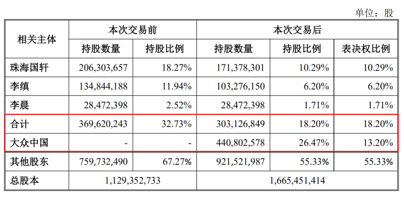 這是因?yàn)楦鶕?jù)《股東協(xié)議》的安排,大眾中國(guó)承諾自上述發(fā)行、轉(zhuǎn)讓的股份登記至其名下36個(gè)月(或其自行決定更長(zhǎng)時(shí)間)起,將不可撤銷(xiāo)地放棄其持有的部分公司股份表決權(quán),使其表決權(quán)比創(chuàng)始股東方(珠海國(guó)軒、李縝及其一致行動(dòng)人李晨)的表決權(quán)比例低至少5%以上。