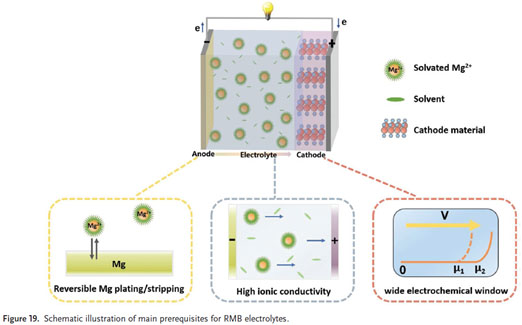 電解質(zhì)在電池中起著傳遞離子的作用,尋求兼具高的離子電導(dǎo)率、寬的電化學(xué)穩(wěn)定窗口以及能夠可逆沉積/溶解鎂的電解質(zhì)材料是推動鎂離子電池發(fā)展的必要條件,如圖19所示。
