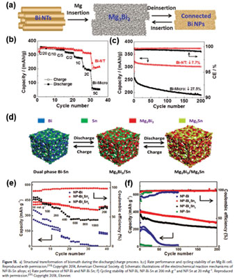 金屬鎂負(fù)極耐腐蝕性較差,表面生成的鈍化膜使Mg2+難以通過,從而限制了其電化學(xué)活性;相比于單純的金屬鎂負(fù)極,將Sn,Sb和Bi等金屬與Mg進(jìn)行合金化反應(yīng)所形成的金屬間化合物,具有高體積容量和較低的過電勢,如圖18所示,測試結(jié)果表明所得合金化合物是一類潛在的高比能可充鎂電池負(fù)極材料。