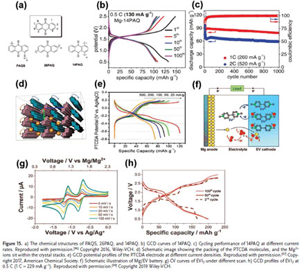 圖15 有機(jī)材料是一種典型的轉(zhuǎn)化型儲鎂正極材料。轉(zhuǎn)化型材料充分利用充放電過程中結(jié)構(gòu)重排和化學(xué)鍵斷裂所釋放的巨大容量,這些相結(jié)構(gòu)的變化是電化學(xué)可逆的。因此,通過打破框架的限制,轉(zhuǎn)化型正極材料的Mg儲存性能可以達(dá)到插入型正極材料的幾倍。