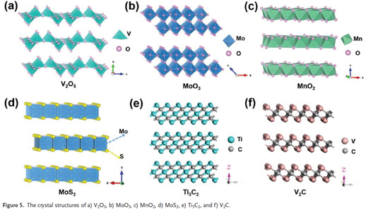 圖5 幾種典型插入型層狀正極材料的晶體結(jié)構(gòu)。充放電過程中,鎂離子在材料的層間進(jìn)行可逆嵌入/脫出,因此,材料層間距的大小對儲鎂性能有著重要的影響。通過超聲、利用小分子插層、或?qū)⒓{米材料與之復(fù)合,不僅能夠防止材料層與層之間的堆疊,而且可以增大材料的層間距,加快鎂離子的遷移動力學(xué),進(jìn)而獲得優(yōu)異的儲鎂性能。