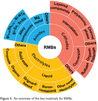 圖3 RMBs的關(guān)鍵材料包括正極、負(fù)極和電解液。根據(jù)反應(yīng)機(jī)理,對插層型正極(層狀化合物、聚陰離子型化合物、Chevel相等)和轉(zhuǎn)換型正極(硫族化物、有機(jī)物等)材料進(jìn)行分類和介紹,闡明結(jié)構(gòu)對Mg2+離子遷移動力學(xué)的影響;對Mg負(fù)極材料(鎂金屬、合金化合物等)的改性和界面問題進(jìn)行詳細(xì)闡述;分析液態(tài)電解質(zhì)(格林試劑、含硼試劑等)和固態(tài)電解質(zhì)(有機(jī)固態(tài)電解質(zhì)、有機(jī)-無機(jī)復(fù)合固態(tài)電解質(zhì)等)材料的獨(dú)特優(yōu)勢與存在的不足。