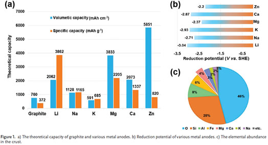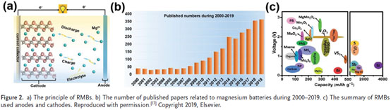 圖1對比各種金屬電極的理論容量(圖1a)、還原電位(圖1b)和在地殼中的豐度(圖1c),結(jié)果顯示:鎂具有高的理論容量(3833mAh cm-3),低的還原電位(-2.37 vs SHE)和豐富的地殼含量。更重要的是,與鋰負(fù)極相比,鎂負(fù)極在循環(huán)過程中不產(chǎn)生枝晶,更安全,并在許多電解質(zhì)中能夠?qū)崿F(xiàn)可逆沉積/剝離?;谏鲜鲈?,RMBs有望成為潛在的大規(guī)模儲能系統(tǒng)之一。