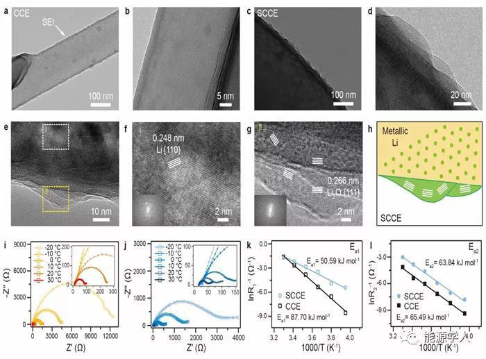 圖 4. 增溶劑介導(dǎo)的碳酸酯電解液誘導(dǎo)的納米波浪狀SEI結(jié)構(gòu)。(a-b)傳統(tǒng)碳酸酯電解液中枝晶狀沉積與無定型SEI的冷凍電鏡圖。(c-h)增溶劑介導(dǎo)的碳酸酯電解液中,大塊狀沉積與富含無機組分的波浪狀SEI的冷凍電鏡圖。(i-l)SEI層以及去溶劑化活化能壘差異。