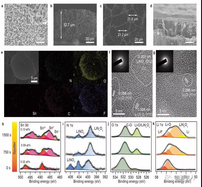 圖 3. 增溶劑介導(dǎo)的碳酸酯電解液中鋰金屬沉積。(a-d)在傳統(tǒng)碳酸酯電解液(a-b)和增溶劑介導(dǎo)的碳酸酯電解液(c-d)中的沉積形貌(面容量5 mA h cm-2)對比。(e)鋰金屬沉積SEM和EDS mapping。(f-g)增溶劑介導(dǎo)的碳酸酯電解液(f)和傳統(tǒng)碳酸酯電解液(g)中SEI的HRTEM圖。(h-k) 增溶劑介導(dǎo)碳酸酯電解液誘導(dǎo)下SEI的XPS Sn 3d, N 1s, O 1s and Li 1s不同深度組分分析。