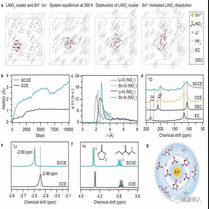 由于Li+和 NO3?的強靜電作用,硝酸鋰在酯類溶劑(如:EC, DEC)中的溶解度通常小于800 ppm。作者發(fā)現(xiàn)在碳酸酯電解液中引入Sn2+路易斯酸,作為增溶劑,可以有效地促進硝酸鋰溶解(1-5 wt%)。AIMD模擬發(fā)現(xiàn)硝酸鋰晶體會被Sn2+增溶劑擾亂,隨后硝酸根出現(xiàn)在Sn2+的溶劑層中并跟隨Sn2+在溶液中擴散移動。在1 M LiPF6 EC/DEC電解液中,一個Sn2+中心至少可以配位四個NO3?。RDF表明Sn2+-N(NO3?)離子對的g(r)峰強度遠大于Li+-N(NO3?)離子對,并且NO3?在Sn2+溶劑鞘的平均停留時間大于在Li+溶劑鞘中的時間。17O, 7Li和1H核磁譜進一步證實了增溶劑介導(dǎo)的碳酸酯電解液中的配位-溶劑化結(jié)構(gòu)。Sn2+增溶劑可以有效促進硝酸鋰晶體在酯類電解液中的解離,并與NO3?和EC分子形成穩(wěn)定的溶劑鞘結(jié)構(gòu)。