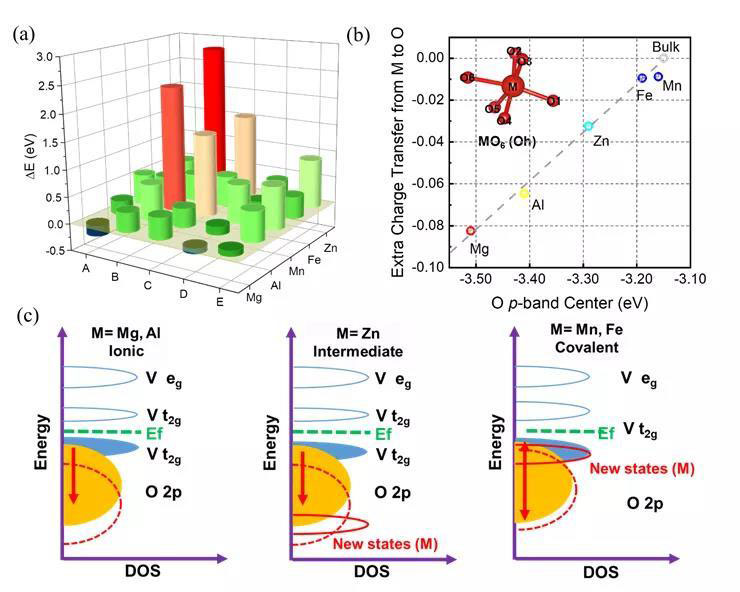 對(duì)兩種摻雜位點(diǎn)下結(jié)構(gòu)的電子結(jié)構(gòu)進(jìn)行第一性原理計(jì)算,并引入氧的p帶中心作為材料在鋰離子脫嵌過(guò)程穩(wěn)定性的判斷標(biāo)準(zhǔn)。研究表明,Mg摻雜對(duì)電子導(dǎo)電性的影響較小,而V位摻雜會(huì)一定程度改善鋰離子遷移速率,并且造成氧的p帶中心負(fù)移,保證了高電位下過(guò)渡金屬氧化還原的穩(wěn)定性。隨后,我們將這種那個(gè)Mg摻雜行為的規(guī)律推廣到其他常見(jiàn)的金屬離子,如Al、Mn、Fe和Zn,并詳細(xì)討論了摻雜體系電子、離子的輸運(yùn)行為、結(jié)構(gòu)穩(wěn)定性的判斷依據(jù)等,為后續(xù)相似工作的開(kāi)展提供了參考。