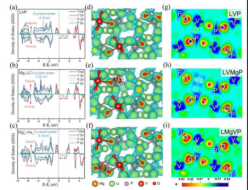 對(duì)于聚陰離子型的磷酸釩鋰材料,除Mg可以取代Li與V位,其他離子如Al、Mn、Fe、Zn在能量上更傾向于V位的取代,并且摻雜引起的體系中的電荷非平衡更傾向于通過(guò)空位/間隙Li引入而不是極化子形成來(lái)得到補(bǔ)償。聚陰離子型磷酸釩鋰的電子導(dǎo)電機(jī)制主要為極化子遷移,常見(jiàn)的陽(yáng)離子摻雜由于對(duì)極化子濃度影響很小,因而幾乎不能提高其電子導(dǎo)電性。另外,磷酸釩鋰中引入的間隙Li+離子可以作為過(guò)渡態(tài),進(jìn)一步增強(qiáng)鋰離子傳輸速率。氧的p帶中心可以用來(lái)描述磷酸釩鋰摻雜體系的穩(wěn)定性,其遠(yuǎn)離費(fèi)米能級(jí)的負(fù)偏移被認(rèn)為可以抑制氧在高電位下參與電荷轉(zhuǎn)移,進(jìn)而增加磷酸釩鋰的多電子氧化還原穩(wěn)定性。