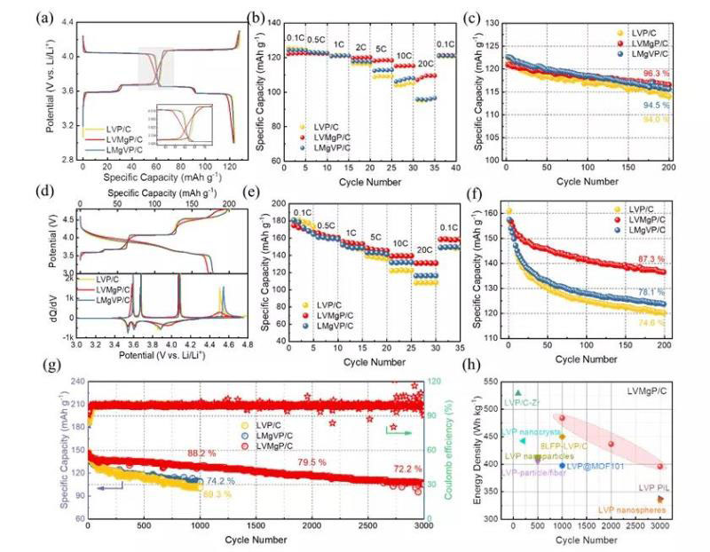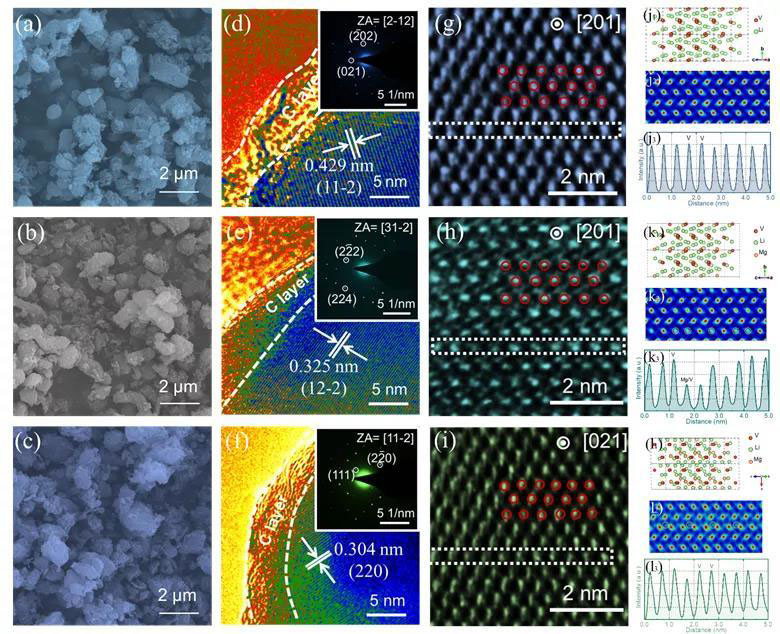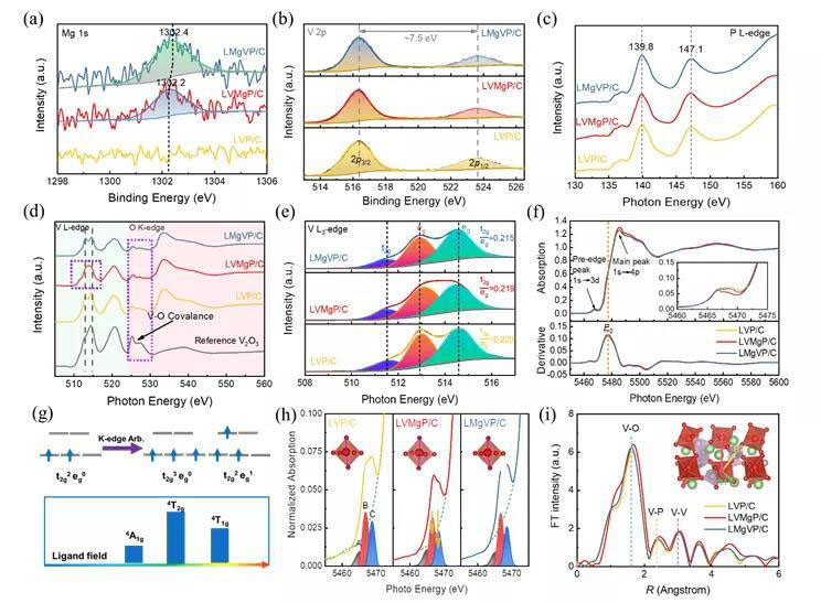 通過(guò)采用包括XPS、XAS在內(nèi)的光譜學(xué)手段和SEM、TEM在內(nèi)的電子顯微學(xué)手段,對(duì)不同位點(diǎn)Mg摻雜磷酸釩鋰的結(jié)構(gòu)進(jìn)行了深入分析。結(jié)果表明,V位摻雜會(huì)造成V-O多面體對(duì)稱性增強(qiáng),晶胞體積具有擴(kuò)大的趨勢(shì),而Li位摻雜對(duì)本體結(jié)構(gòu)的影響較小。
