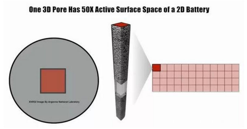 一個(gè)3D孔的活性表面空間是一個(gè)2D電池的50倍