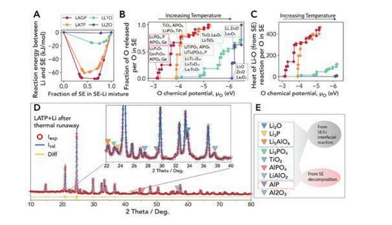 研究團(tuán)隊(duì)選取了四種主流的氧化物固態(tài)電解質(zhì)材料為研究對(duì)象,即具有鈉超離子導(dǎo)體結(jié)構(gòu)(NASICON)的Li1.5Al0.5Ge1.5(PO4)3(LAGP)和Li1.4Al0.4Ti1.6(PO4)3(LATP),鈣鈦礦結(jié)構(gòu)的Li3xLa2/3-xTiO3(LLTO),以及石榴石結(jié)構(gòu)的Li6.4La3Zr1.4Ta0.6O12(LLZO)。采用絕熱加速量熱儀定量測(cè)定了它們與金屬鋰發(fā)生熱失控反應(yīng)的特征溫度、產(chǎn)熱速率和產(chǎn)熱量。結(jié)果表明, LAGP和LATP與金屬鋰在加熱過(guò)程中均發(fā)生了明顯熱失控并伴隨著大量放熱,LLTO出現(xiàn)了輕微放熱現(xiàn)象,而LLZO沒(méi)有明顯產(chǎn)熱。隨后研究團(tuán)隊(duì)結(jié)合DFT熱力學(xué)計(jì)算發(fā)現(xiàn),固態(tài)電解質(zhì)與金屬鋰發(fā)生化學(xué)反應(yīng)產(chǎn)生的熱量不足以引起熱失控,熱失控的原因很有可能是固態(tài)電解質(zhì)與金屬鋰接觸時(shí)界面化學(xué)反應(yīng)產(chǎn)生的熱量導(dǎo)致氧化物固態(tài)電解質(zhì)材料自身分解產(chǎn)生氧氣,氧氣進(jìn)一步與金屬鋰發(fā)生化學(xué)反應(yīng)導(dǎo)致劇烈產(chǎn)熱。研究團(tuán)隊(duì)進(jìn)一步通過(guò)對(duì)反應(yīng)產(chǎn)物進(jìn)行精確的XRD物相分析證實(shí)了這一猜想。以上研究表明了一些被廣泛認(rèn)為具有較高結(jié)構(gòu)熱穩(wěn)定性的固態(tài)電解質(zhì)材料,在與金屬鋰負(fù)極接觸后,高溫下依然可能發(fā)生熱失控反應(yīng)。這表明材料自身的熱穩(wěn)定性并不能代表其在電池內(nèi)整體的熱穩(wěn)定性,需要將固態(tài)電解質(zhì)與電池內(nèi)其他活性材料與非活性材料的反應(yīng)特性考慮在內(nèi)。