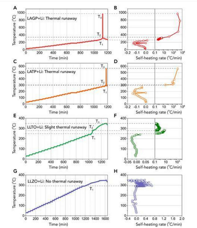 圖 1. 四種氧化物固態(tài)電解質(zhì)與金屬鋰接觸下的ARC測(cè)試結(jié)果。