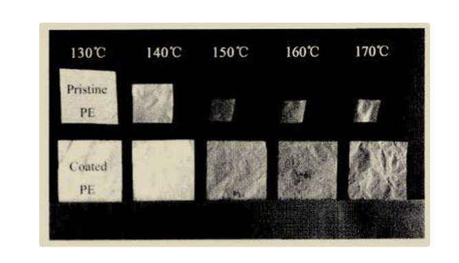 圖5 普通PE膜和經(jīng)勃姆石表面涂覆的PE膜在不同溫度下的熱處理對比圖