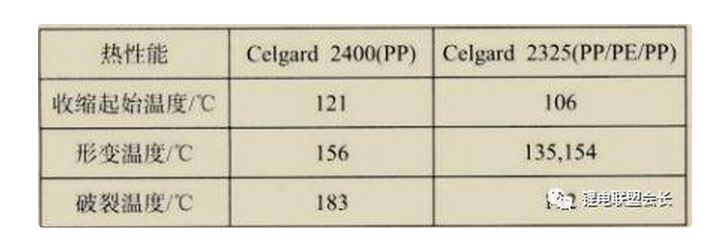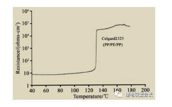 例如,單層PP膜的熔融 裂溫度比單層PE膜高約30℃,三層PP/PE/PP復合膜的閉孔 度和單層PE膜接近而熔融破裂溫度卻與單層PP膜相近,表明三層復合隔膜在較低的溫度下閉孔后仍有30℃左右的溫度范圍保持較高的電阻,從而保證電池的安全。