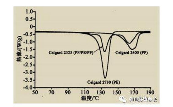 圖3 Celgard 2730(PE)、Celgard 2400(PP)、Celgard 2325(PP/PE/PP)隔膜 的DSC測試圖