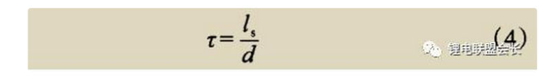 式(4)中,ls是粒子透過隔膜的路程,d為隔膜的厚度。由于離子實際透過隔膜的路程難 以測量,通常利用式(5)近似計算得到隔膜的孔道曲折度。
