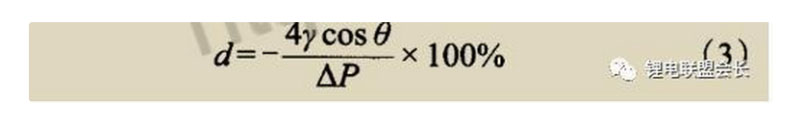 ③根據(jù)在單一孔道中的液體完全由毛細孔道內(nèi)擠出時所施壓力與孔道直徑的相對關(guān)系,依照Laplace方程可得隔膜孔徑,Laplace方程如式(3)所示。