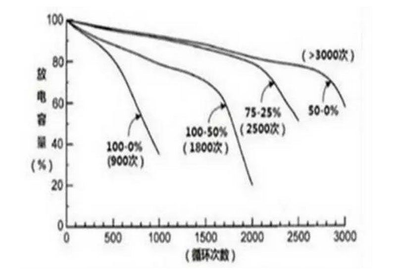 上圖為某三元鋰電池的充放電特性圖,可以看出,不同的充放電方式對(duì)電池的壽命影響不一樣,如上圖數(shù)據(jù),以25%-75%充放電的壽命可以達(dá)到2500次,即我們所說(shuō)的電池淺充淺放。電池壽命這個(gè)話題我們以后還會(huì)深入討論。
