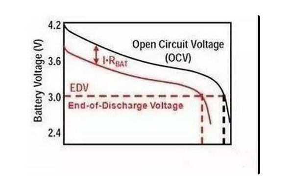 用數(shù)據(jù)說(shuō)話,下圖表示一電池放電曲線,X軸表示放電量,Y軸表示電池開(kāi)路電壓,電池理想放電狀態(tài)為黑色曲線,紅色曲線是考慮到電池內(nèi)阻時(shí)的真實(shí)狀態(tài)。