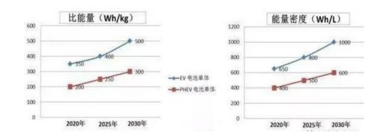 根據(jù)2016年發(fā)布的“節(jié)能與新能源汽車(chē)技術(shù),可以大概對(duì)動(dòng)力電池發(fā)展趨勢(shì)有一個(gè)概念,如上圖所示,到2020年,純電動(dòng)汽車(chē)電池單體比能量要達(dá)到350Wh/kg。
